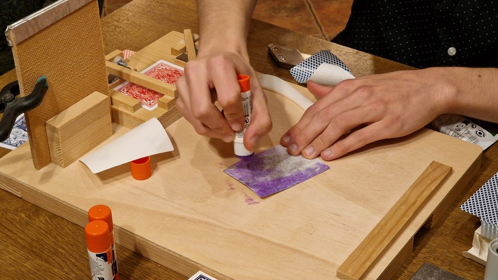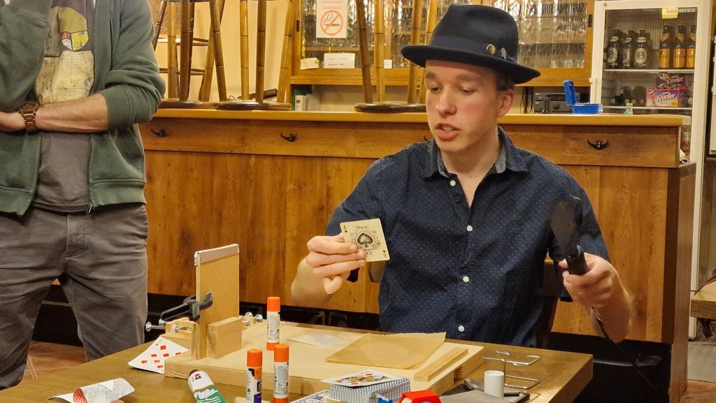 Und jetzt stellt sich – in Brechung seiner bisherigen Rolle – heraus, dass er ein begnadeter Bastler mit sehr profundem Wissen über Spielkarten ist! Der Zirkelabend, den er gestaltet, ist eine absolute Wucht! Statt theoretischer Vorträge wird gebastelt – es müssen nicht alle mitmachen, aber alle wollen! Aus Lennards Tasche kommt ein Gerät nach dem anderen zum Vorschein (und sein britischer Humor taucht wieder auf, als er Gerät zum Erhitzen von Thermokleber als Bügeleisen für Kleinwüchsige bezeichnet).